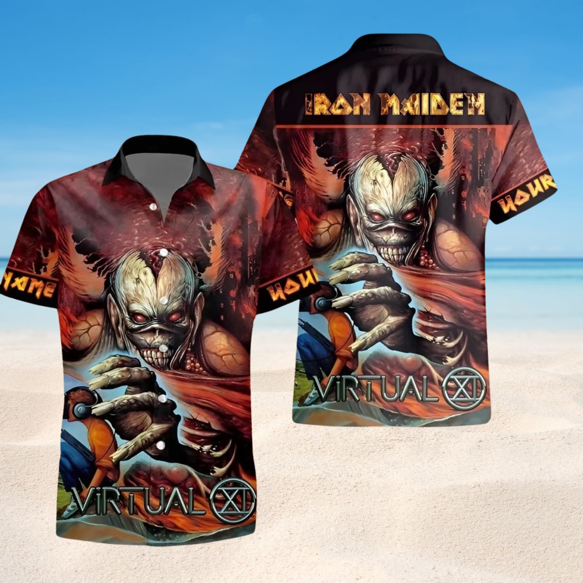 This intense Iron Maiden shirt transforms freaky mascot Eddie into a raging cyber demon! It shows him emerging from fiery red and orange flames with a freaky metallic skull face, giant claws, and glowing eyes ready to attack! The bright colors and details like horns and spikes make him look extra menacing and futuristic. The back features the same vicious Eddie along with the band name in sharp metal letters. It's a crazy fusion of chill tropical flowers and dark supernatural villain vibes. Fans of both warm vacation shirts and Eddie's most sinister looks will love how this turns up the heat on his usual creepiness!